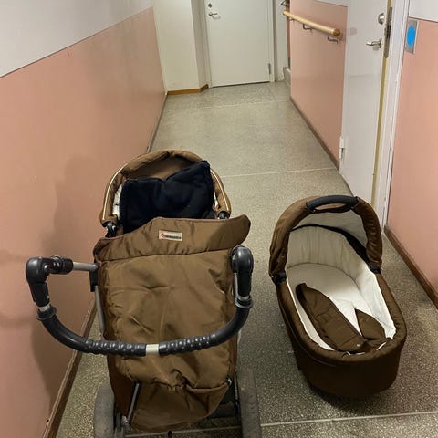 Emmaljunga barnvagn i blått. Utrustad med justerbart handtag och sufflett. Passar för barn och är tillverkad med fokus på funktionalitet och komfort. I köpt 2018 köpte nya hjul/däck 2023