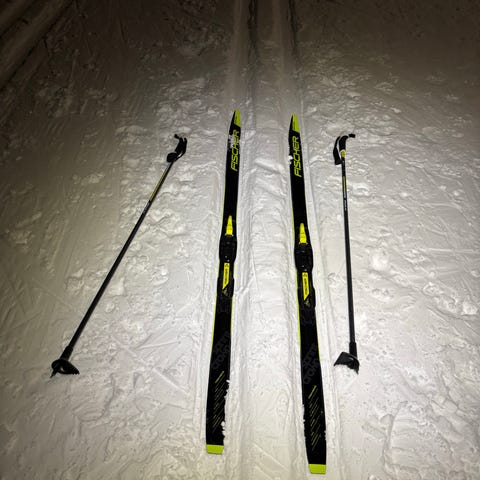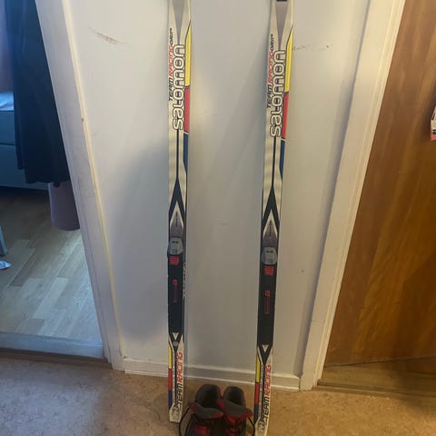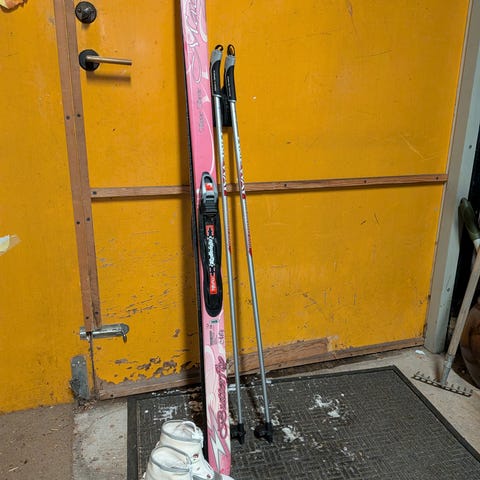 Längdskidor barn 140 cm, pjäxor stl 33 och stavar