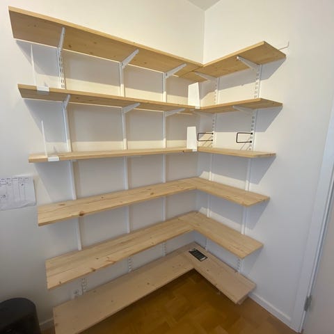 Säljer ett väggmonterat hyllsystem med vita skenor och hyllplan i trä.