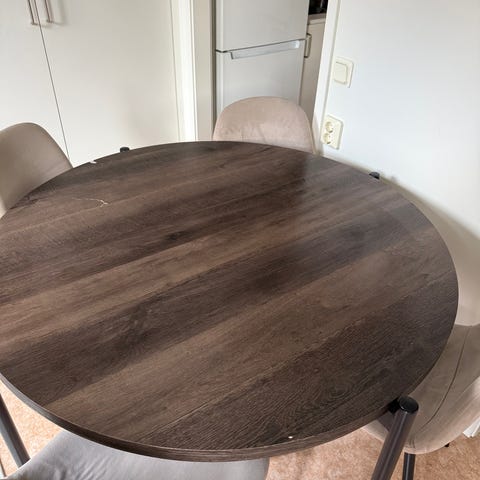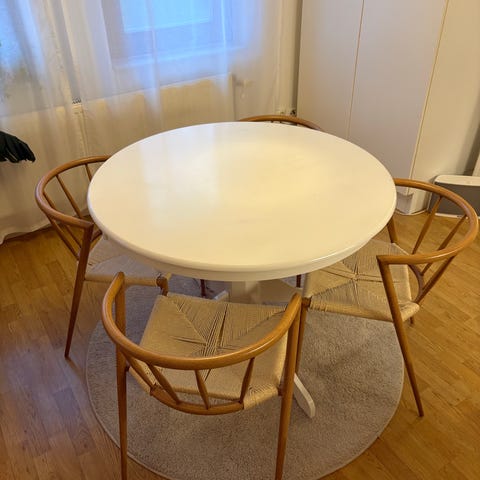 Ovalt bord i vitlackerad mdf med metallben. Bordet heter Plaine och är köpt på Mio.