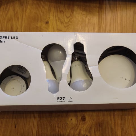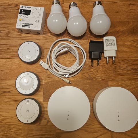 Liten blandning av IKEAS sortiment ”smarta hem” set med 5 smarta uttag, 2 fjärrkontroller och smart-hub ”Trådfri” för uppkoppling mot modem ink kablar.