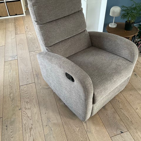 Mio reclinerfåtölj i grått plysch tyg. Fåtöljen har en mjuk sittdyna och stoppade armstöd, fällbar i rygg och benstöd, hela fåtöljen går att vippa. Du ställer in läge med fjärrkontroll, skön som TV-fåtölj men också för att ta en "tupplur" i... Tyget är rent, det är skiftningar i plyschytan på bilden...