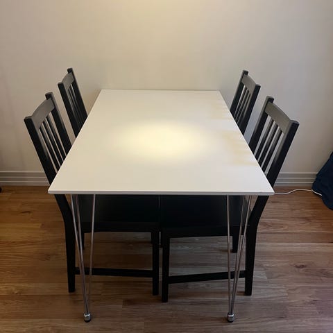 IKEA matbord i vitt trä med rektangulär form och fyra ben. Bordet har en slät yta och är lämpligt för vardagsrum eller matsal.