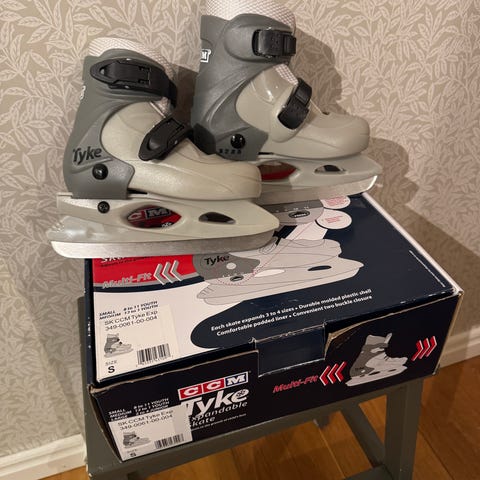 Svarta skridskor med röda detaljer. Justerbar storlek 26-29. Har fungerat mycket bra som första skridsko.