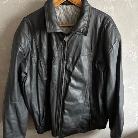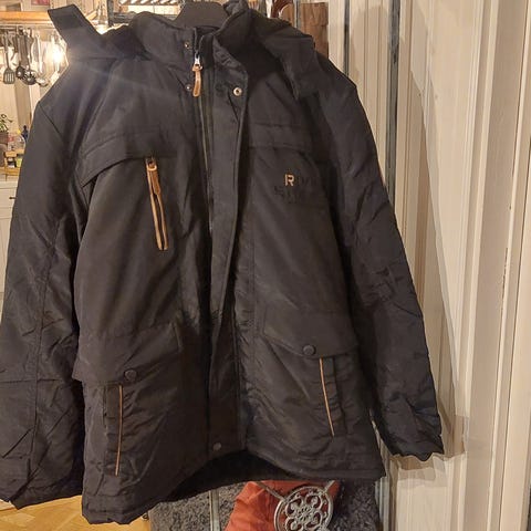 Svart jacka med hög krage och dragkedja. Jackan har två framfickor och en innerficka. Fodrad med rutmönster och svart fleecefoder.