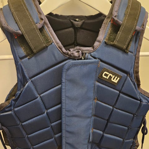 Västen har en flexibel och vadderad konstruktion för skydd under ridning. Den är utrustad med justerbara remmar och ett dragkedjefäste fram för enkel på- och avklädning. Materialet är slitstarkt och anpassat för att ge både komfort och säkerhet.