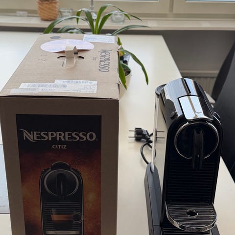 Nespresso maskin och Nespresso Aeroccino3 mjölkskummare i svart färg. En elektrisk apparat för att brygga barista kaffe med mjölk och andra drycker. Även till enbart kaffe.