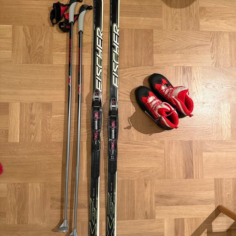 Längdskidor med pjäxor och stavar