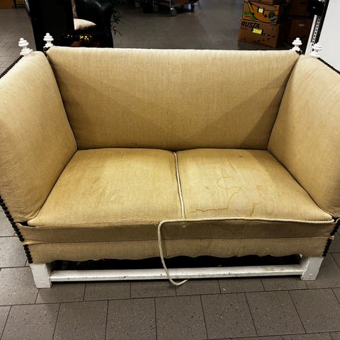 schäslong/kanapé i massiv träram , klädd i rött randigt typ + 2 kuddar. Snidade detaljer.