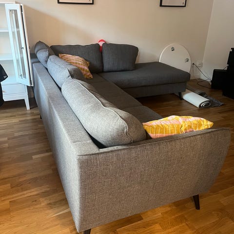 Tyget kan behövas tvättas (inga permanenta fläckar skulle jag säga), annars är soffan hel och fin!