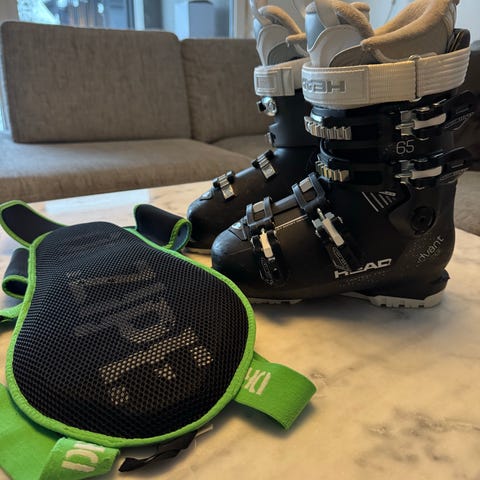Slalompjäxor, hjälmar och ryggskydd