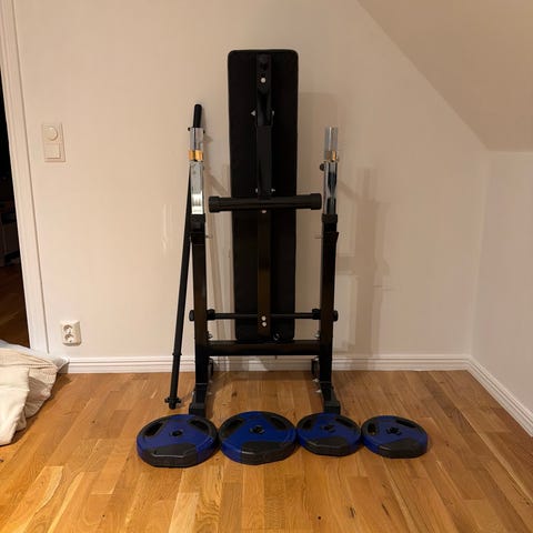 Träningsbänk med stativ för skivstång, inkluderar flera vikter och hantlar i olika storlekar. Bänken är justerbar och utrustad med benstöd för olika övningar.