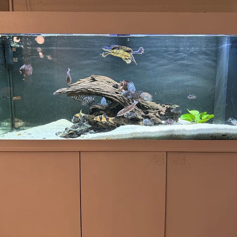 Ett 100 cm brett och 50 cm högt akvarium, komplett med ett huvudbord, värmare, två filter, luftpump, dekorativa figurer och många andra tillbehör, inklusive 13 fiskar och 2 rensfiskar.