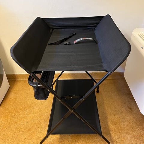 Vit skötbord med tre hyllplan i trä