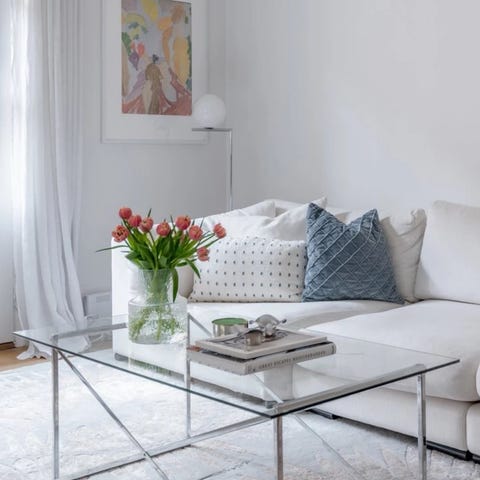 Mörk glasskiva 65x65 cm. Bordet är 50 cm högt.