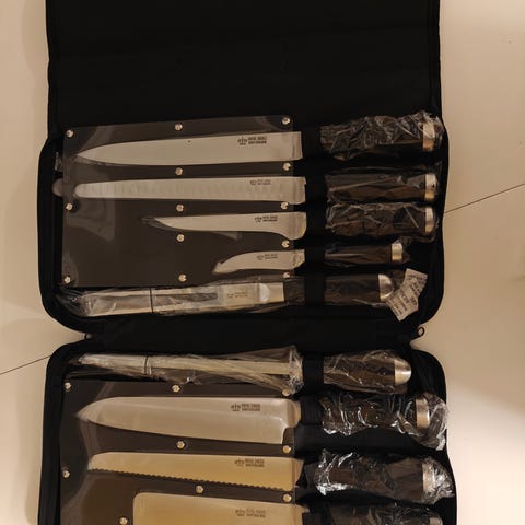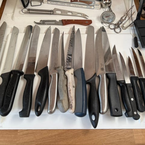 Säljer köksknivar i fint skick , en kniv har skadad spets. Säljer även bestick från IKEA. Bestick består av skedar knivar och gafflar.