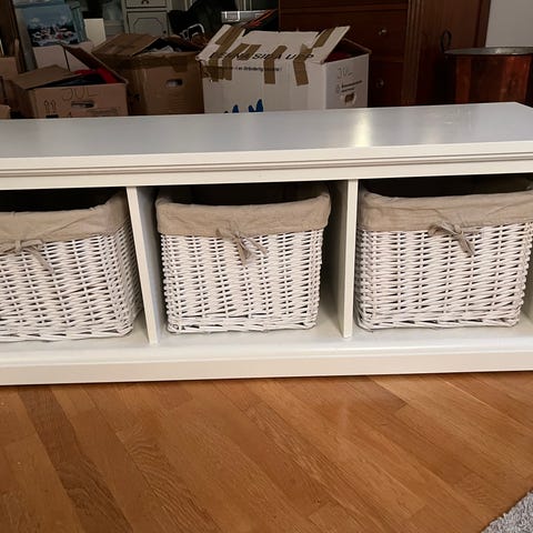 Funktionell bänk / sideboard / sidobord med tre öppna fack – perfekt som förvaring i barnrum, hall, vardagsrum eller sovrum. Stabil konstruktion.