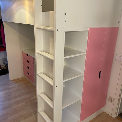 IKEA Loftsäng - barnmöbel med skrivbord och förvaring i vitt och rosa. Möbeln inkluderar en loftsäng med integrerad stege, skrivbordsyta under sängen, flera lådor och ett skåp för förvaring. Passar för barnrum och erbjuder kombinerad sov- och arbetsyta.