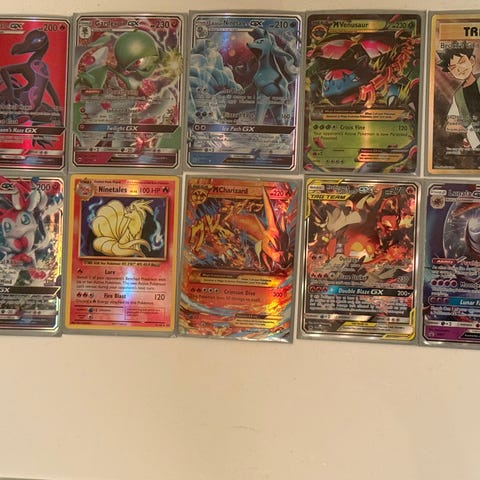 Fyra Pokémon-kort med olika motiv och egenskaper. Korten är i standardstorlek för samlarkortspel och har färgglada illustrationer på framsidan. Kortens baksida visar den klassiska Poké Ball-designen. Korten kan användas för samling eller spel. Alla kort e i fint skick