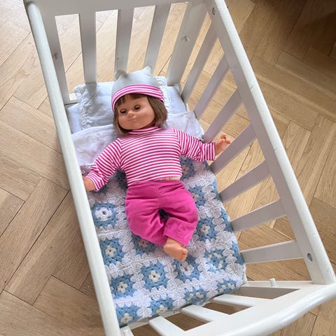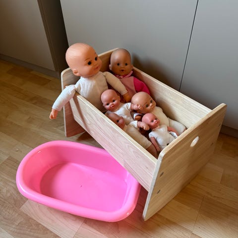 En docksäng i trä. Rosa. Med madrass. Knappt använd.