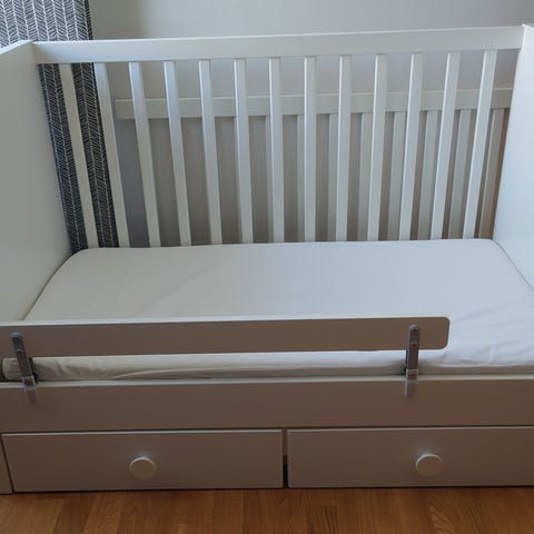 IKEAs populära Myllra i turkos färg, finns inte längre att köpa. Vi har haft den från nyfödd till 3,5års ålder Tack vare att fen går att höja/sänka samt ändra den främre delen. D.v.s. den är en bed side crib som hår att omvandla till spjälsäng och sedan barnsäng. Mer info finns här på IKEAs hemsida: MYLLRA spjälsäng med låda, vit, 60x120 cm - IKEA https://share.google/s6h8gQqUJsDX9sJtd