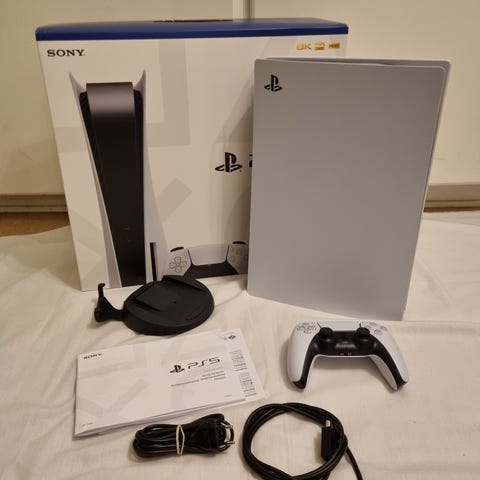 PS 5 spelkonsol Disc version 1TB. Inkluderar en trådlös DualSense-kontroll, ac-adapter, hdmi o laddare för kontroll.