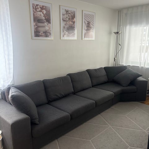 Säljer en bekväm och rymlig Bergamo-hörnsoffa i mörkgrått tyg. Soffan är i bra begagnat skick och passar perfekt för vardagsrum med lite större yta.
