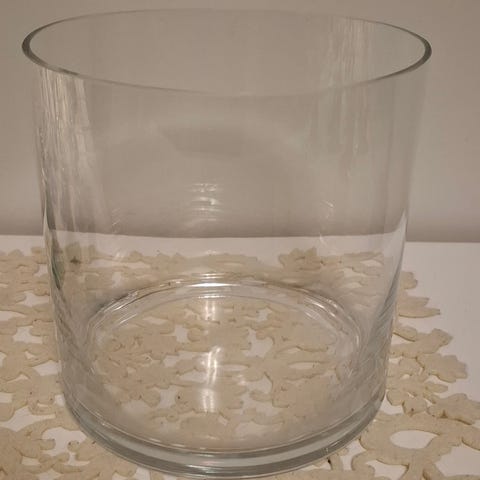 Stor glasskål från IKEA. Har ett litet nagg längst. Skålen har en konisk form och är lämplig för servering eller förvaring av mat.