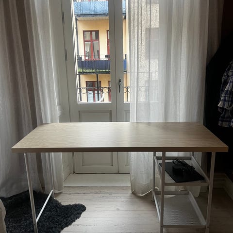 Ljusgrått stativ med bordsskiva i trälaminat.