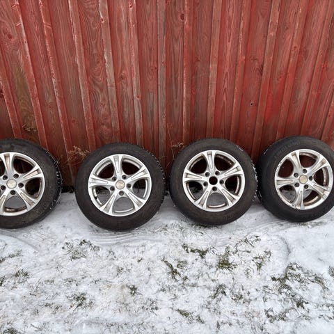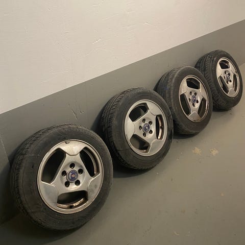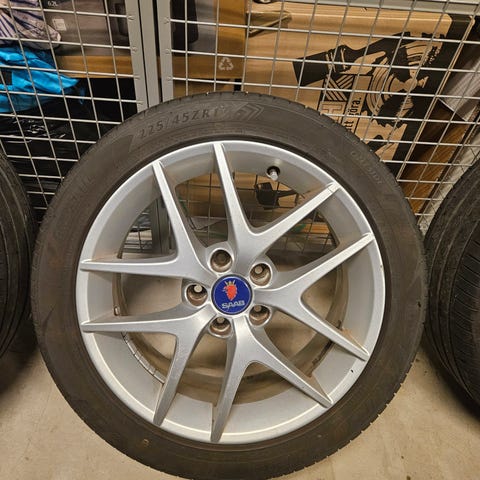 Detta är allt som finns kvar från min fantastiska Saab 9-5:a efter den gav upp och jag med tårar i mina ögon fick skrota den. Fälgarna är något kantstötta. Skulle gissa på att de två bättre däcken har ca 4 mm mönsterdjup och resterande ca. 2 mm kvar. Jag kan ta fler bilder om seriöst intresse finns för en affär. Fälgarna finns att hämta i Sollentuna.