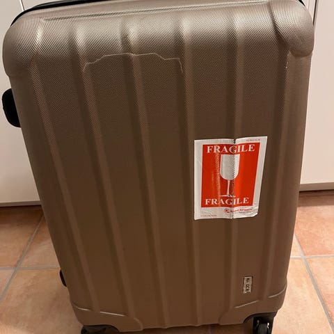 Resväska med hjul, synligt använd, finns fläckar och skrapmärken och en spricka i plasten på utsidan, fungerar annars som den ska, ren och fräsch inuti. Kodlås som fungerar, nyckel saknas. Mått ca 47x39 cm