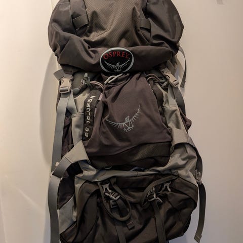 Grå Ospreyryggsäck Farpoint 70L. Justerbara remmar. Perfekt för t.ex backpacking eller camping. Stora väskan är i nyskick. Lilla väskan är endast använd ett fåtal gånger.