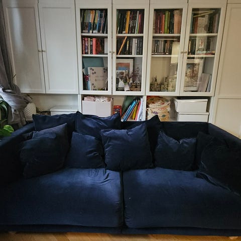 Mörkgrå modulsoffa med tillhörande kuddar i samma färg. Soffan är lite nedsutten på en del av sittdynan (syns lite på sista bilden). Det följer med 3 större kuddar, 2 cylinderformade och 1 liten ( De beiga kuddarna på bilden medföljer inte).