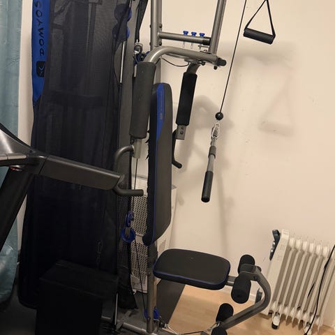 Träningsmaskin Hemmagym med sittdyna i orange och grå ram. Utrustad med olika träningsstationer för styrketräning och muskeluppbyggnad i hemmet.