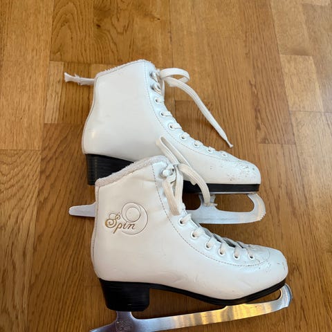 Spin skridskor i barnstorlek 34, vita med snörning och fodrade med mjukt material för komfort.