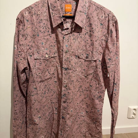 Tunn blåvitrandig sommarskjorta (70% bomull, 30% linne) från Hugo Boss. Storlek Large, slim fit. Skjortan inkluderar ett par stilfulla manschettknappar. Kommer från ett djur- och rökfritt hem.