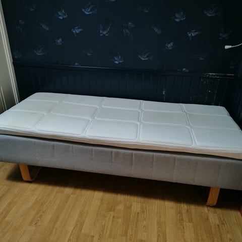 Skänker denna säng med en utdragbar låda för en extramadrass. Längd: 205cm, Bredd: 95cm och Höjd 100cm. Finns att hämta i Bräkne-Hoby.