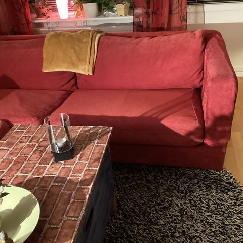 Hörnsoffa klädd i rutigt tyg i gröna, röda och beige toner. Soffan har lösa ryggkuddar, ett praktiskt förvaringsutrymme under sittdelen samt en utdragbar säng under ena delen. Stabil bas i mörkgrönt material. En bekväm och funktionell soffa som passar utmärkt i vardagsrum eller andra sittutrymmen.