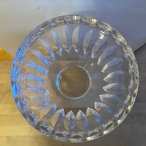 Stabil, tung och dekorativ glasskål. Fyrkantig form , typisk för 1960–80-tal. Kan användas som godisskål eller prydnad.