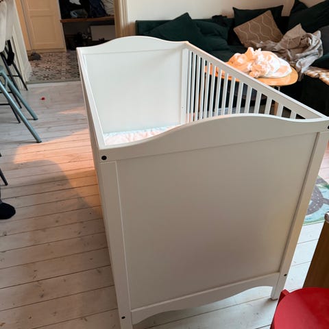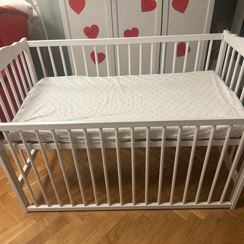 IKEA spjälsäng med förvaringslåda under sängen. Sängen är vit och avsedd för barn.