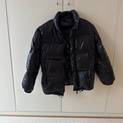 Hooded fleece and quilted glossed shell down jacket. Black color. 100% polyamide NO price tag left, brand new jacket!!