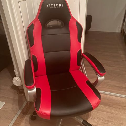 HyperX Gamingstol i svart och rött med vadderad sits och ryggstöd. Stolen har justerbara armstöd och ett extra kuddstöd för ländryggen. Designad för komfort vid längre spelsessioner.