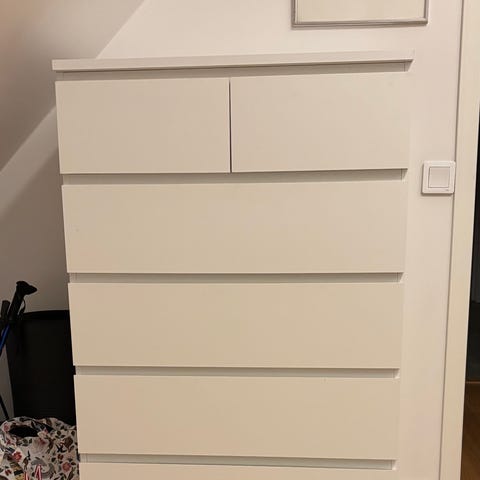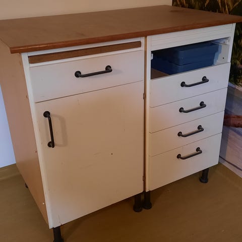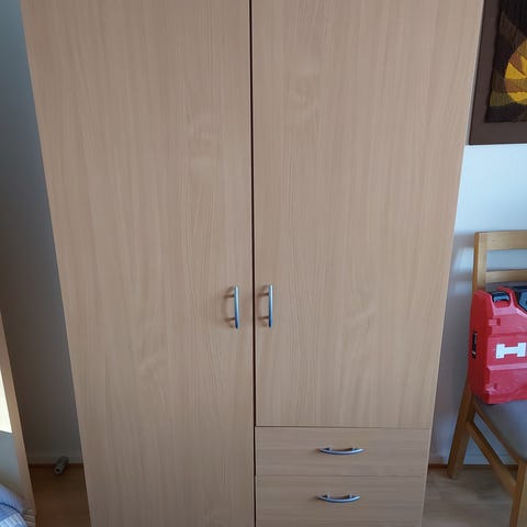 Vi ändrar om i huset och skänker bort vårt vackra ekskåp i äggskalsvitt med två lådor och monterad klädstång , rejält och praktiskt!