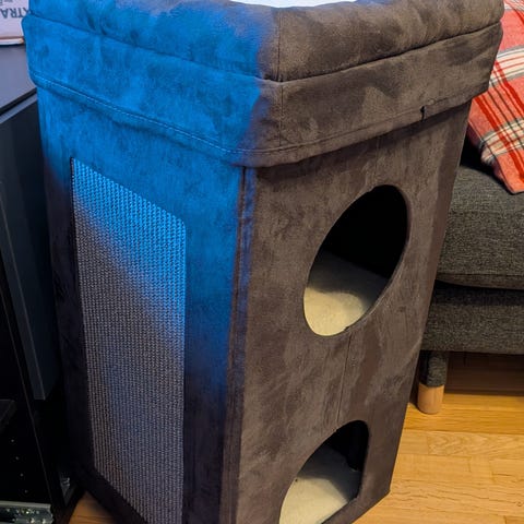 Grå klösträd för katt med flera nivåer, inkluderande hängmatta, kryphåla och klösstolpar. Tillverkad i mjukt tyg och repmaterial för klösning. Passar för inomhusbruk och ger utrymme för lek, vila och klösning för katter.
