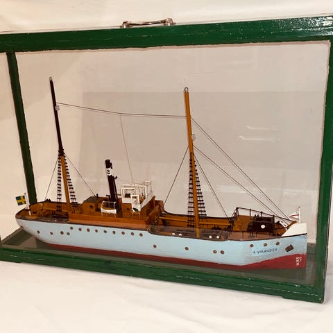 trämodell av en djonk med tygsegel. Seglen är dekorerade med mönster, inklusive en giraff och andra symboler. Modellen har detaljerade riggar och en stabil bas för uppställning. Storlek 30+40