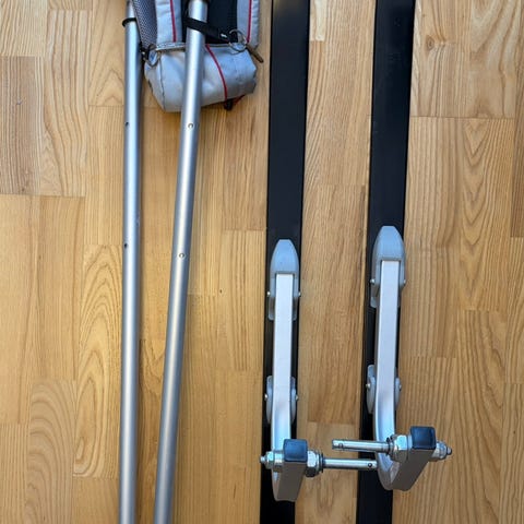 1. Skid-kit med två skidor samt midjebälte med draganordning. Detta är för en dubbel/tvilling-vagn. 500kr