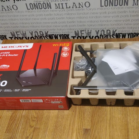 Mercury Router med flera antenner. En nätverksenhet avsedd för trådlös internetanslutning med flera portar och externa antenner för förbättrad signalstyrka och täckning.2.5G&5G Wi-Fi,USB 3.0。Lan