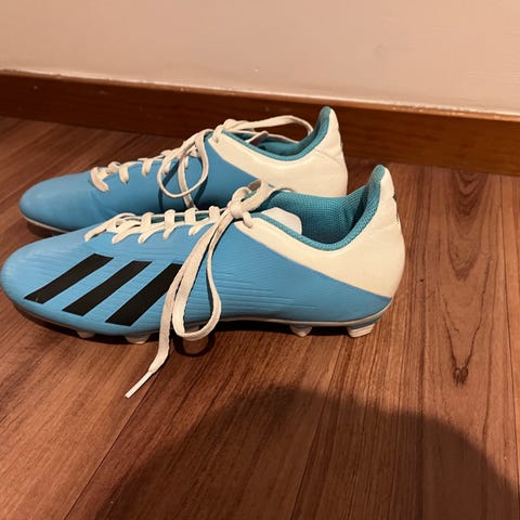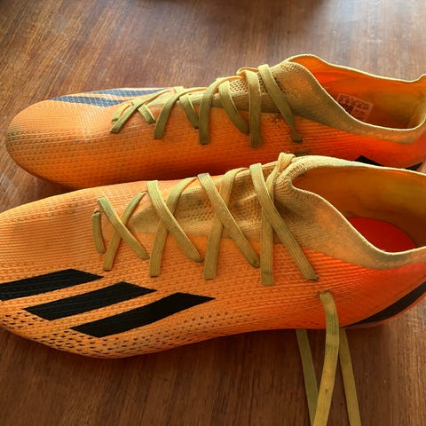Adidas fotbollsskor i storlek 44 med orange och svart färg. Skorna är designade för fotboll med snörning och har en yttersula anpassad för spel på gräs eller konstgräs. Materialet är syntetiskt med detaljer i svart.