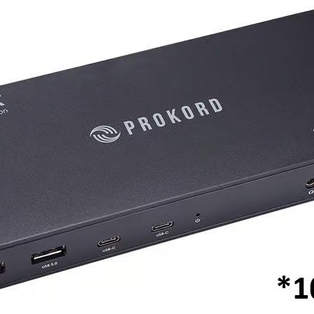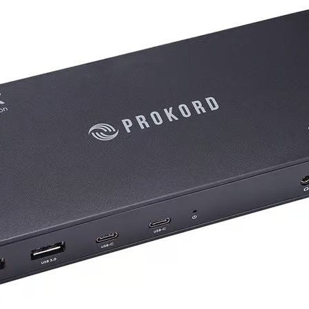 Prokord USB-C dockingstation i aluminiumutförande. Dockningsstationen har stöd för två skärmar med 4K upplösning samtidigt via DisplayLink. Laddar en laptop med upp till 100w. Gigabit Ethernet. Se spec bland bilderna eller i länken nedan.