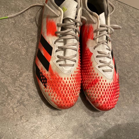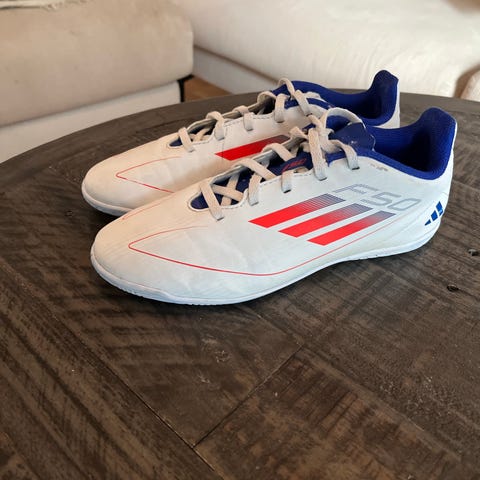 Adidas F50 fotbollsskor i storlek 44. Skorna är gula med blå detaljer och har metalldubbar under sulan för bättre grepp på gräsytor. Tillverkade i syntetmaterial, lämpliga för fotbollsspel.